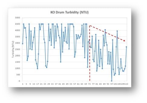 Since the emulsion in the KO drum was identified, the Plant has worked on operational improvements to the hydrocarbon draining procedure. Figure 2 presents the water sample turbidity before and after the operational improvements. The sample appearance can be checked in Figure 3.