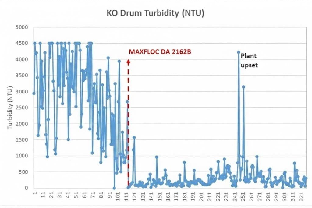 The reverse breaker selected was the MAXFLOC DA 2162B, and the injection point recommended was the liquid return from the 2nd stage KO drum to the 1st stage KO drum, where the phase separation must occur.