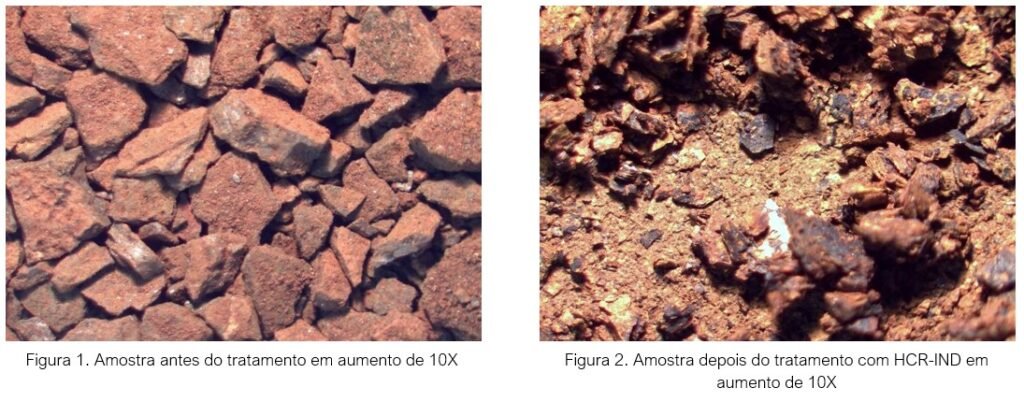 A tabela 1 mostra os resultados de difração de Raio-X da amostra, identificando predominância de magnetita. Os resultados da solubilidade máxima estão sumarizados na tabela 2, com os dados do Enviro-Syn® HCR-IND mostrando ótimo potencial de solubilização.