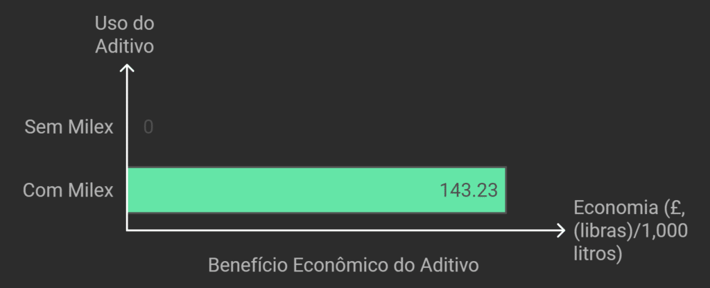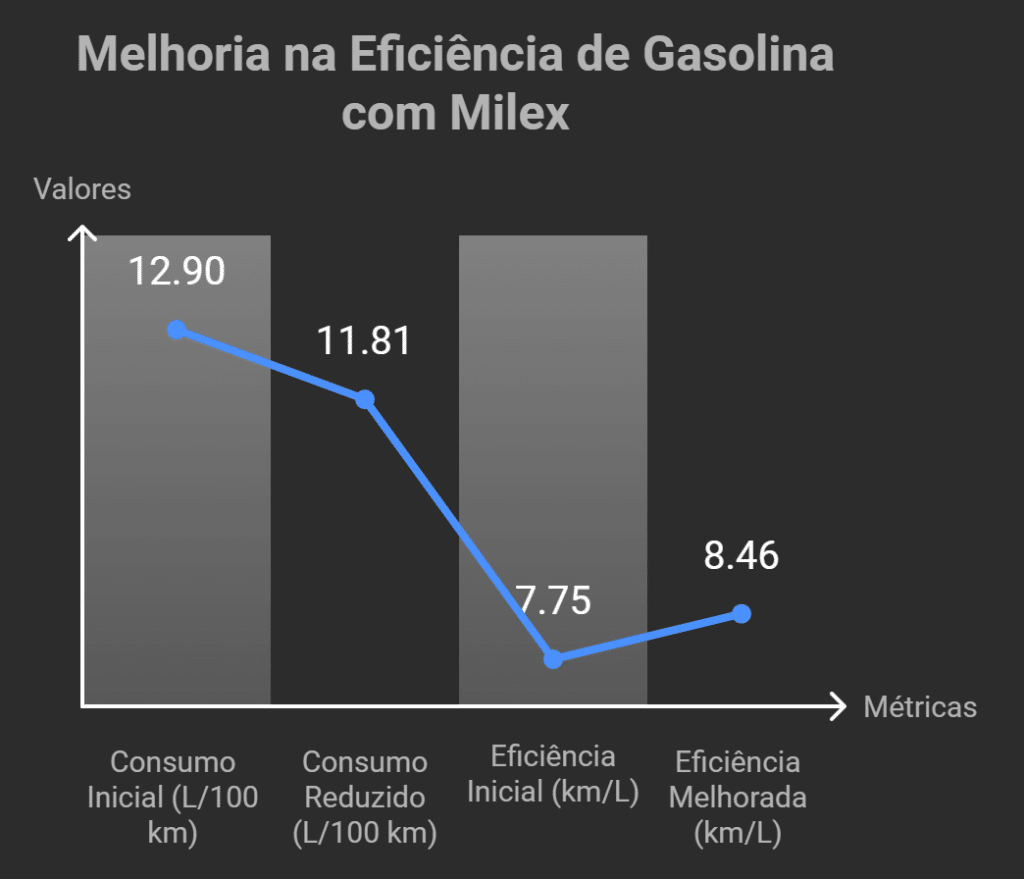 Os dados revelaram uma redução significativa no consumo de gasolina com o uso do aditivo Milex. O consumo inicial de 12,90 L/100 km (21,90 MPG) diminuiu para 11,81 L/100 km (23,90 MPG), resultando em uma melhoria de 9,16% na eficiência de gasolina. Em termos de eficiência, isso representa um aumento de 7,75 km/L para 8,46 km/L.