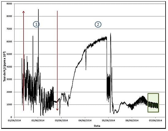 Fig. 2 – Gráfico (PI) onde foram plotados os Teores de H2S oriundos do analisador online em função dos dias de teste do produto MAXSCAV™ OG 523B. 1 – período de injeção a 300 L/h; 2 – período de injeção a 30 L/h. O retângulo verde representa o período de avaliação do produto MAXSCAV™ OG 523B.