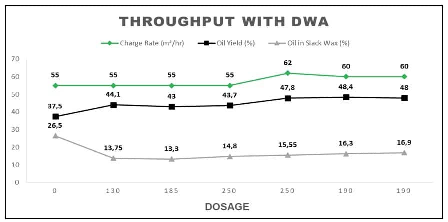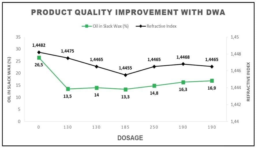 Após a dosagem do aditivo, o rendimento do óleo melhorou para cerca de 80% da taxa de carga da unidade e o conteúdo de óleo na cera de parafina diminuiu para 13,75%, em média. O índice de refração melhorou para uma média de 1,4470. Com dosagens mais altas, os resultados foram ainda melhores.